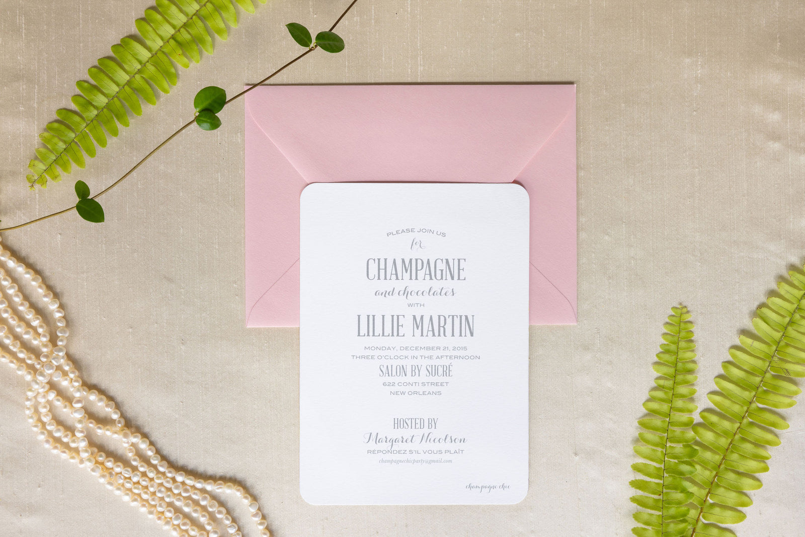 Playful dove gray flat printed typography helps to celebrate the honoree alongside a classic and tasty pairing