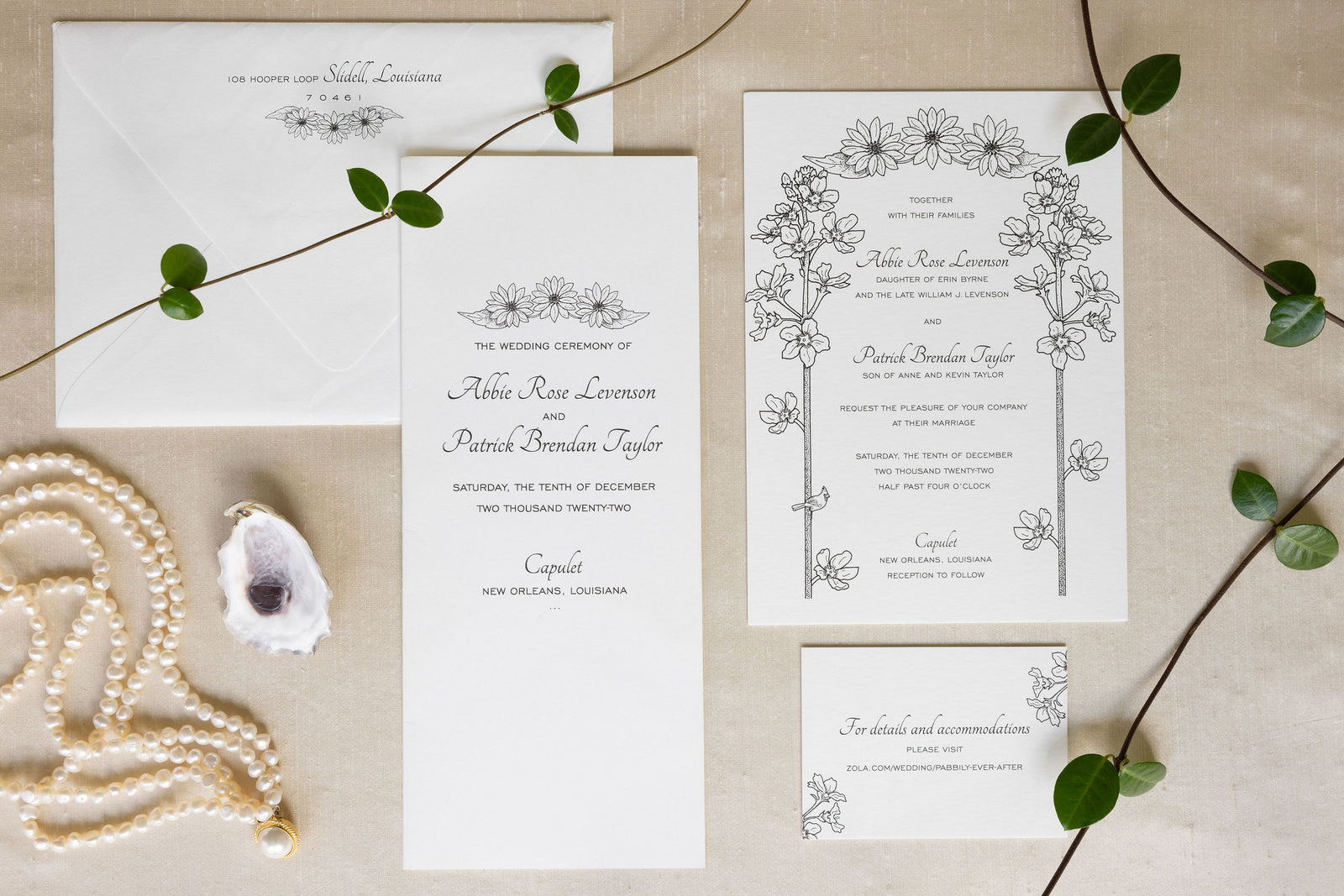 whimsical flowers reminiscent of a chuppah celebrates jewish heritage in black flat printed ink as a cardinal, a nod to the brides father, graces a supporting stem