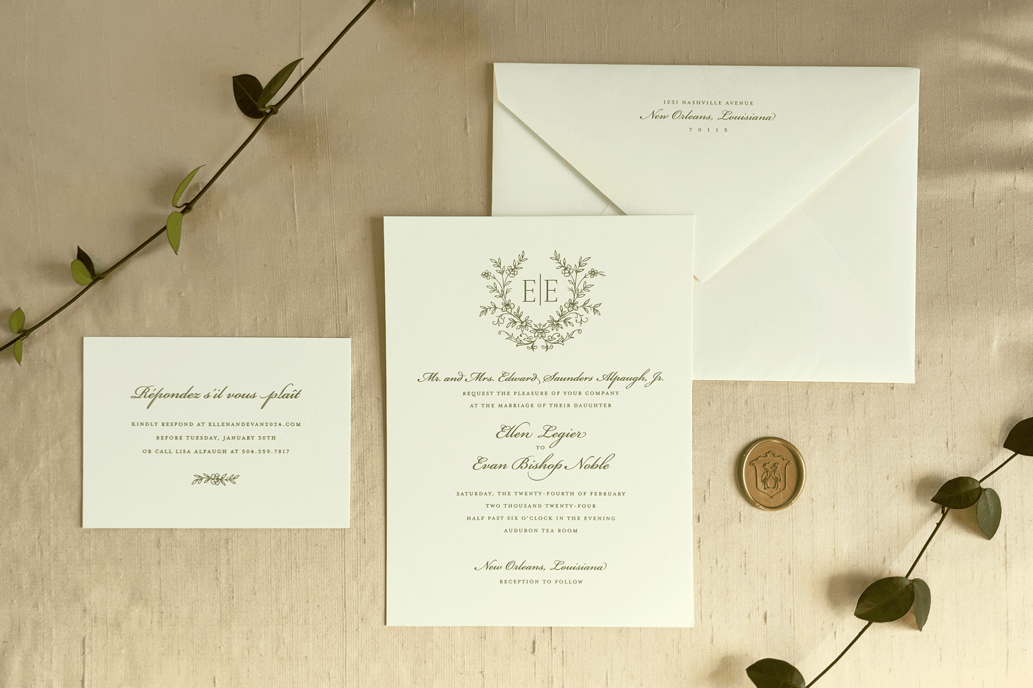 A romantic floral crest embraces a simple monogram and tops classic typography printed in graceful marsh thermography