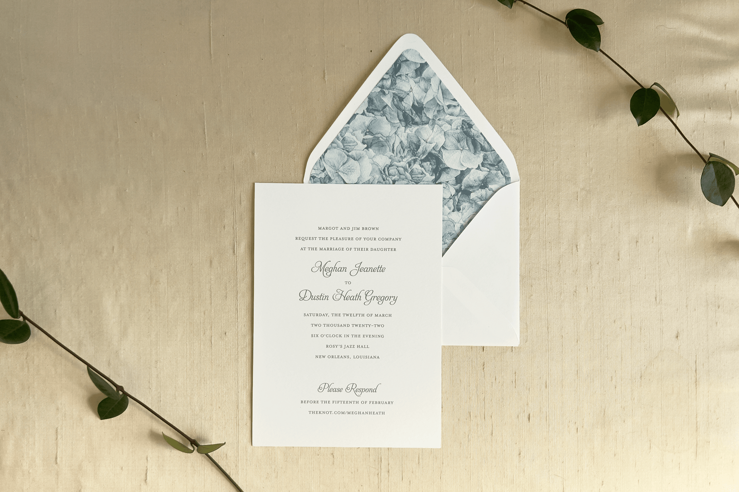 delicately painted hydrangeas bloom from a white envelope and dove grey typography
