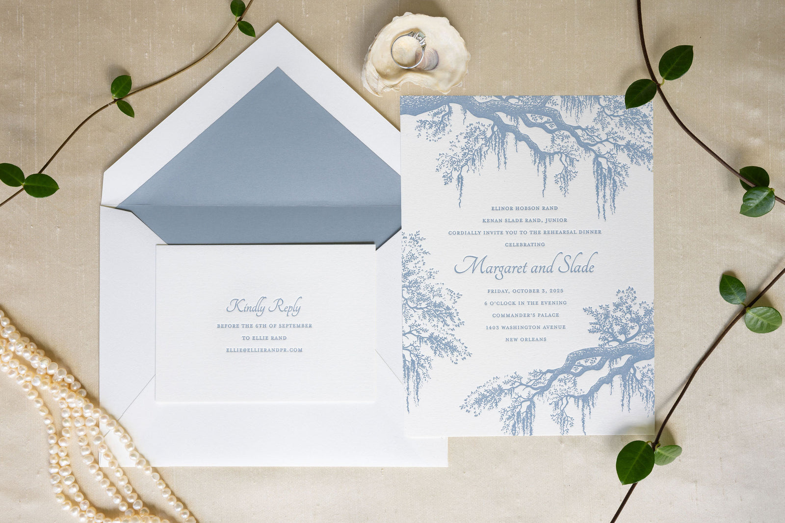 sprawling live oak branches draped in spanish moss frame classic typography letterpressed in french blue ink with a solid envelope liner to match.