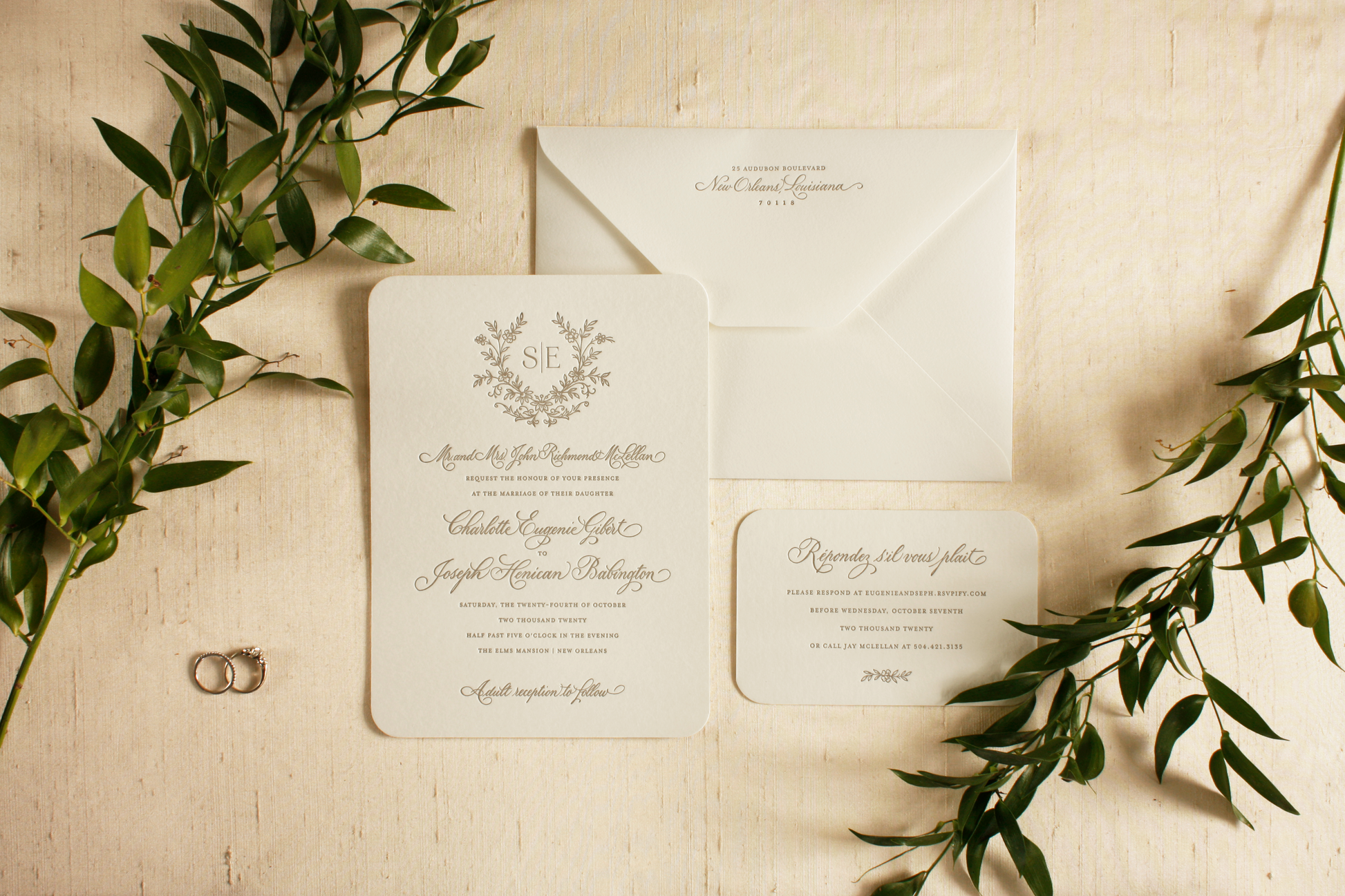 TAUPE LETTERPRESS ON ECRU ARTURO PAPER.