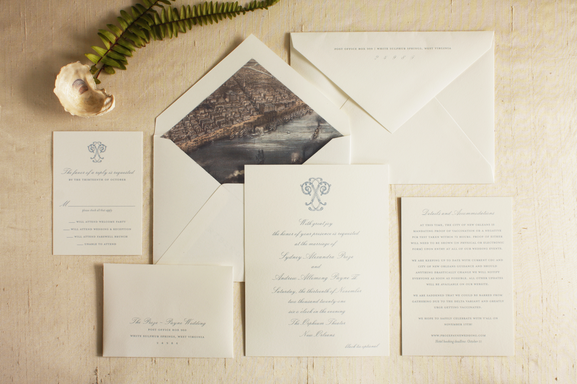 A vintage monogram redrawn to resemble wrought iron pairs with a vintage New Orleans river scene.